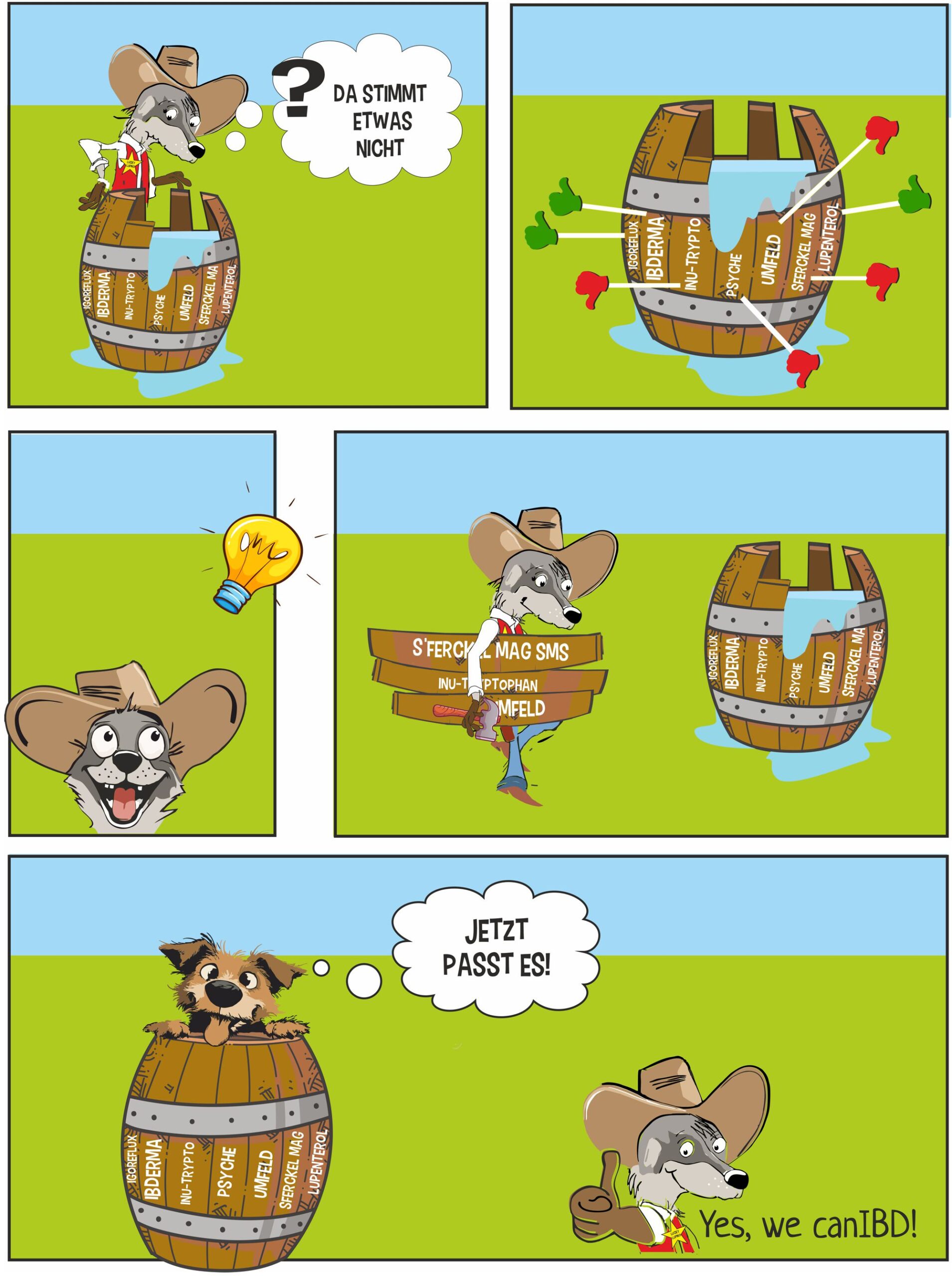 Der Erfolg der canIBD-Therapie wird von jenem Faktor (= Daubenhöhe) bestimmt, der am wenigsten verfügbar ist. Somit ist das Erkennen und der Ausgleich der Mangelfaktoren selbst das Ziel. Das kann mitunter auch „Schwammiges“ wie eben ein für den Hund „ungutes“ soziales Umfeld und/oder eine leidende Psyche des Patienten implizieren, die wir mitunter (anthropozentrisch) nur bedingt realisieren…