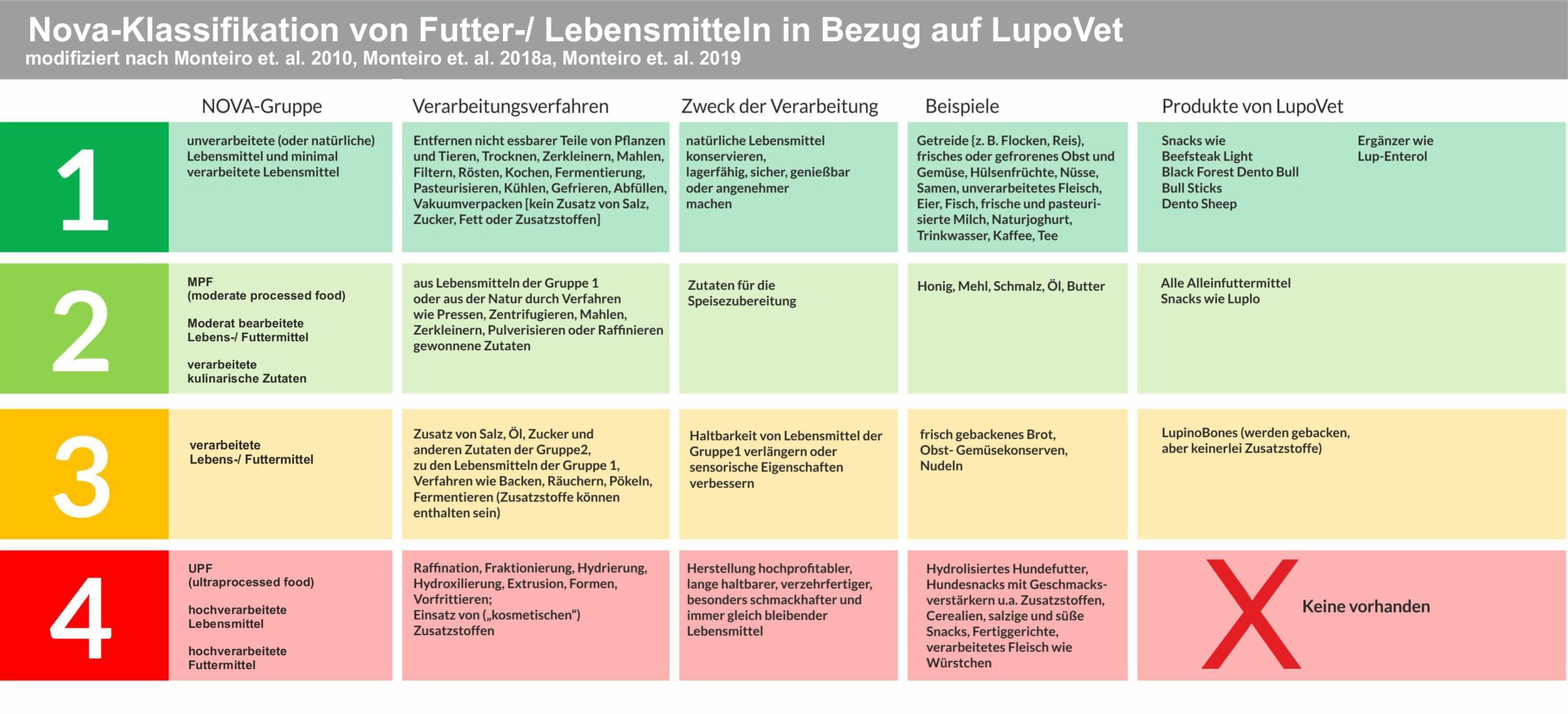 Hier eine Tabelle zum Vergleich der Novaklassifikation von LupoVet-Produkten und anderen Hundenahrungen: